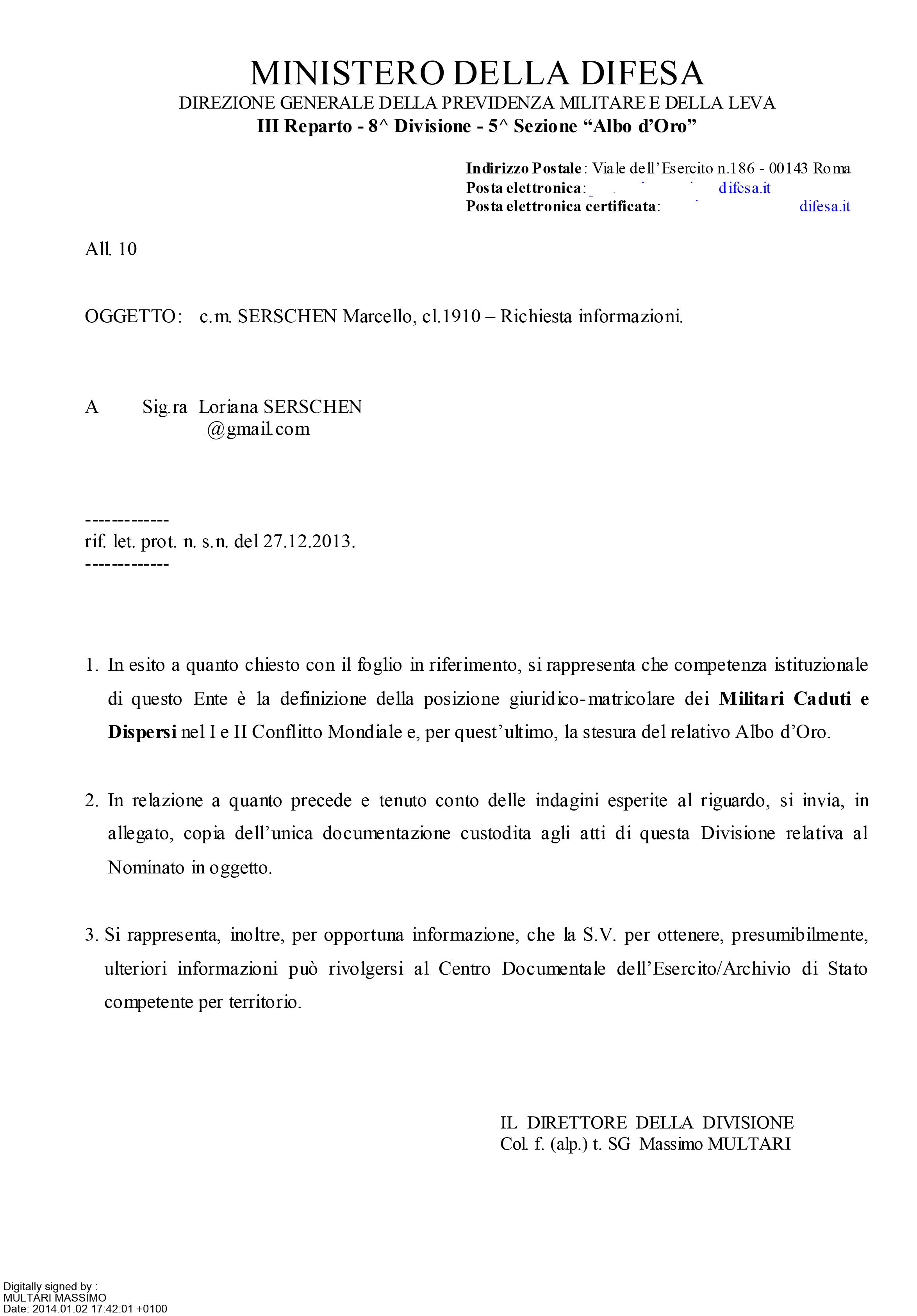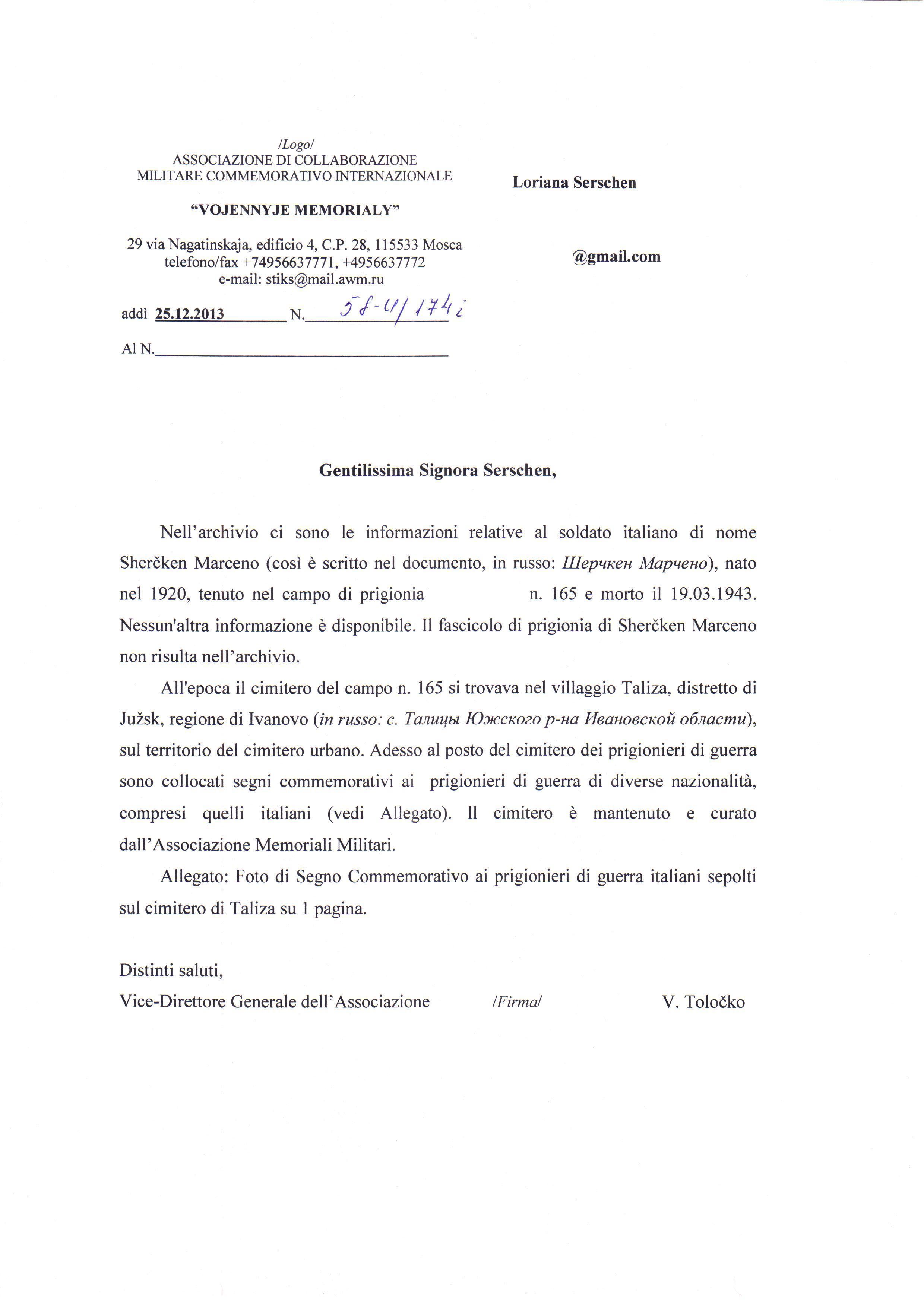 Nel 1995 mio padre ricevette una telefonata dai Carabinieri che lo informavano di avere notizie di mio nonno. Dopo la caduta del muro di Berlino, e il conseguente nuovo corso della storia russa, si era potuto accedere agli archivi fino allora secretati, e furono consegnati al Ministero della Difesa gli elenchi dei deceduti in prigionia. I Carabinieri diedero a mio padre una lettera del Ministero, dove gli si comunicava che il cap. mag. Serschen Marcello, già dichiarato disperso nei territori dellʹex Unione Sovietica, era deceduto nel campo di prigionia n. 165 Taliza Staz Uscia ‐ Reg. Ivanovo (Russia) il 19 marzo 1943, ironia della sorte il giorno della festa del papà.