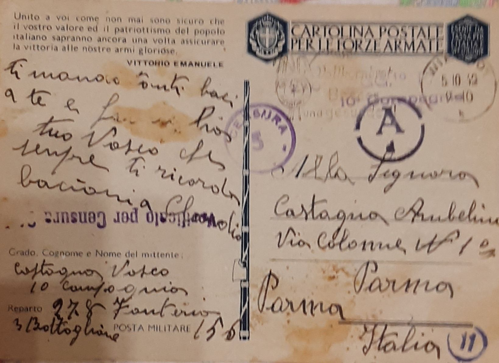 L’ incontro con Gianfranco Castagna, nipote di Vasco, un Fante disperso del 278° Reggimento, mi è sembrato subito non fosse frutto di un semplice caso. Ne è nato infatti un rapporto di stima reciproca e di dialogo a seguito del quale si è potuto ricostruire la figura del nonno come uomo e soldato, collaborando con passione a tutte le fasi dell’analisi della documentazione e contestualizzandola al momento storico in cui veniva prodotta.