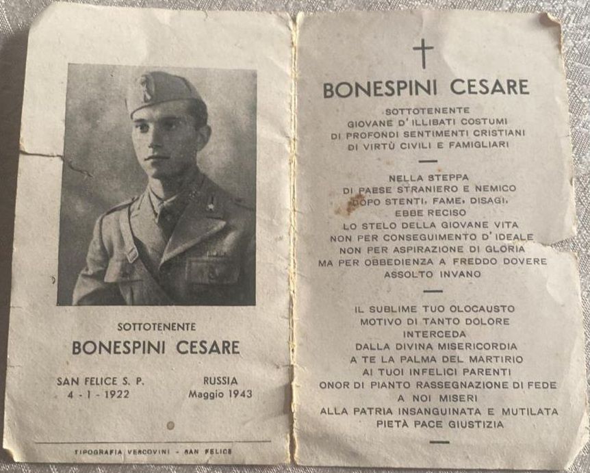 Di Cesare Bonespini, come purtroppo per tanti giovani ventenni giunti al Fronte Russo e scomparsi ad oltre tremila chilometri da casa, rimangono poche tracce della sua giovane esistenza se non il profondo dolore della famiglia testimoniato dal necrologio stampato su un “luttino” che raccoglie molti anni dopo la sua scomparsa tutto ciò che di lui chi lo amava voleva far sapere.