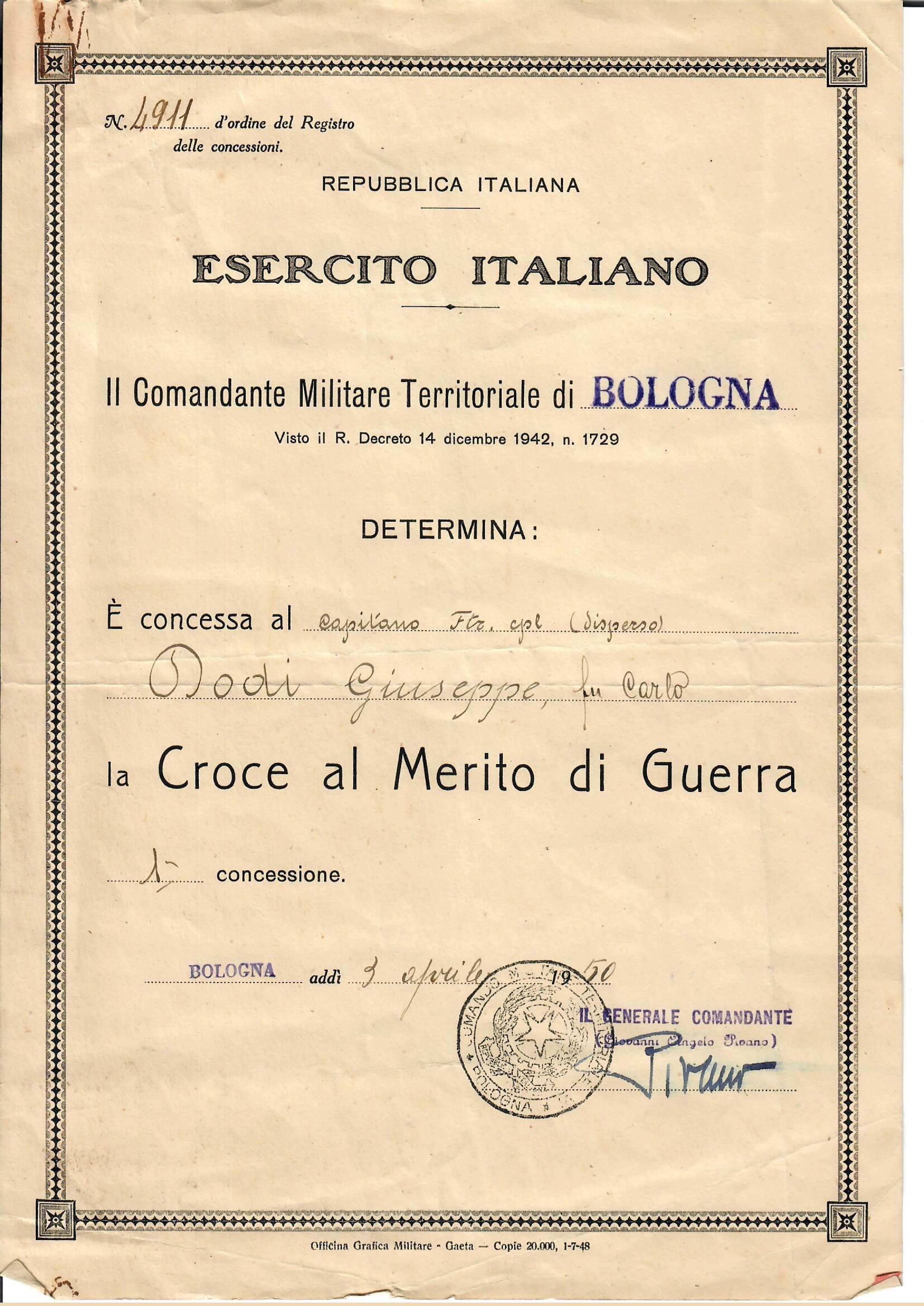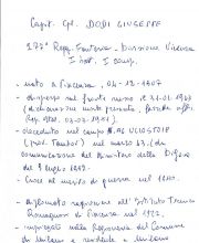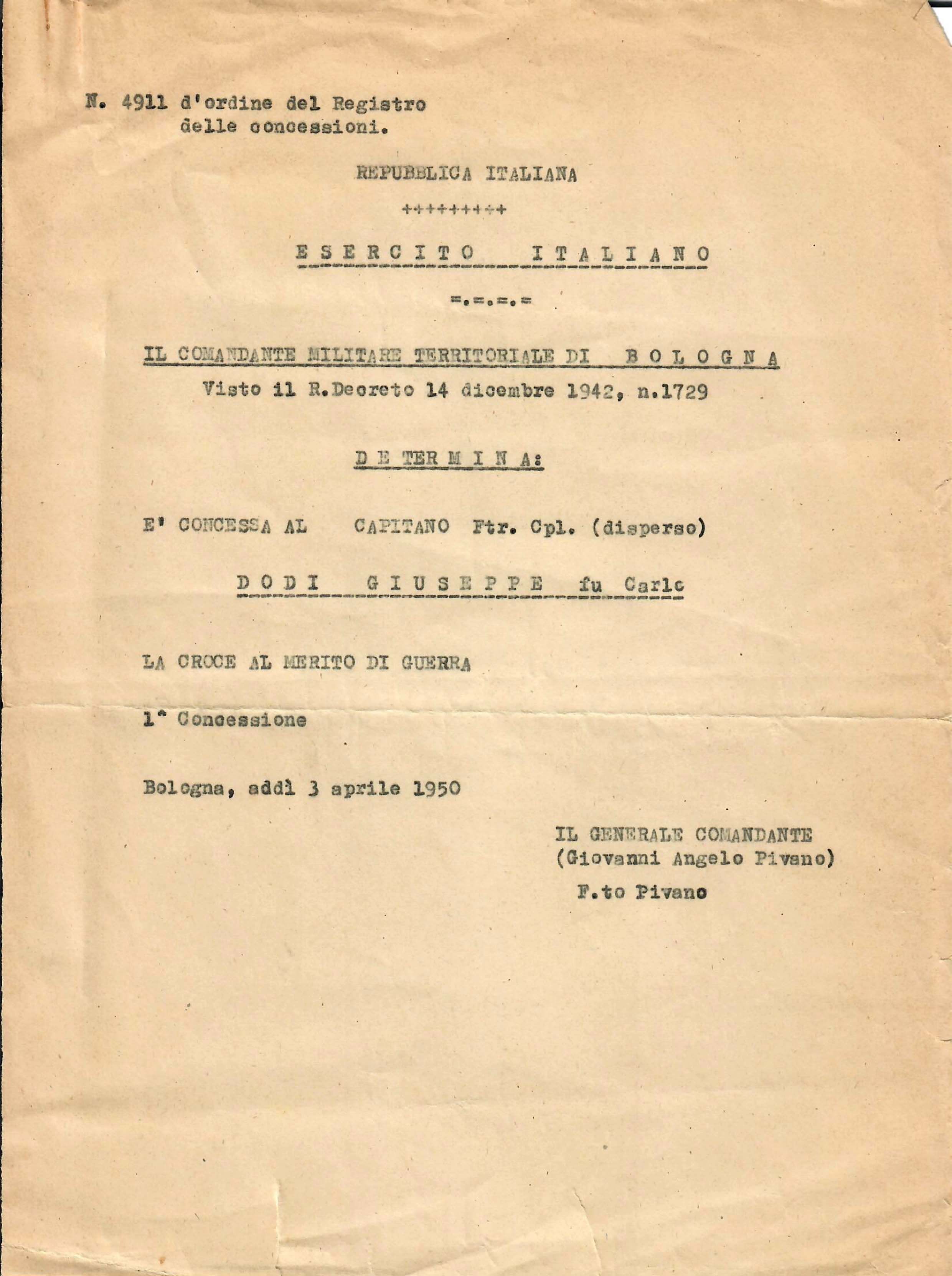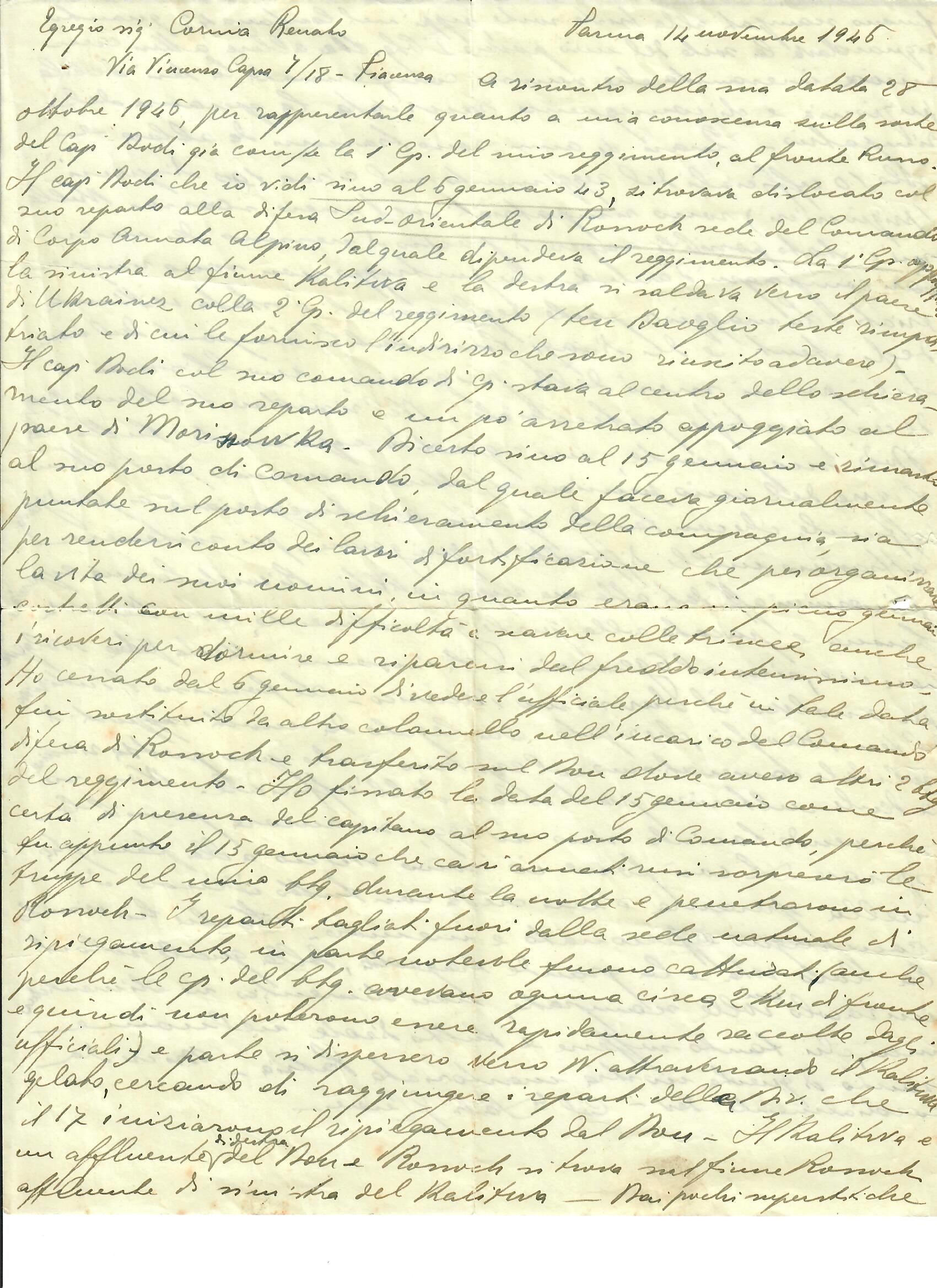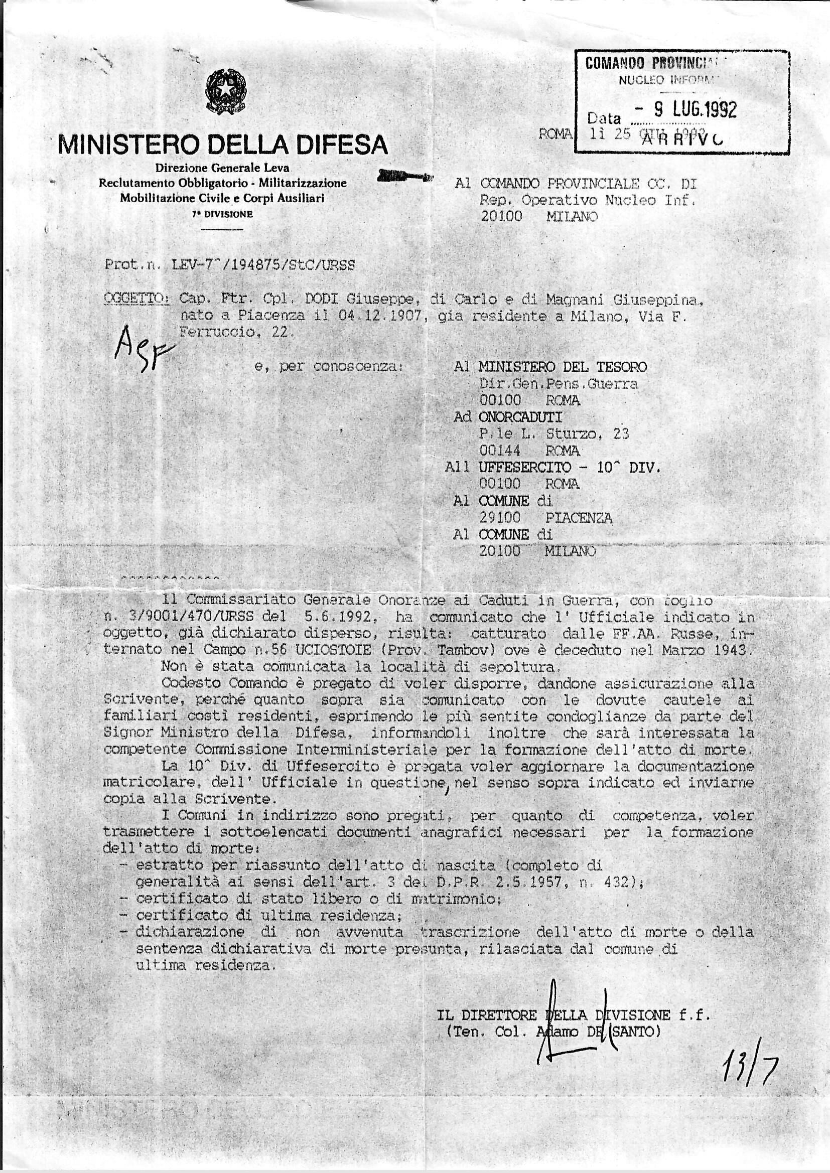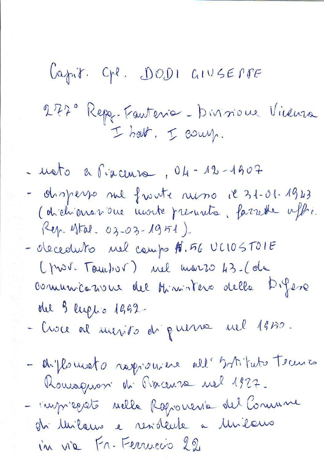 A riscontro della sua datata 28 ottobre 1946, per rappresentarle quanto a mia conoscenza sulla sorte del Cap. Dodi già com/te la 1a Cp. del mio reggimento, al fronte Russo.