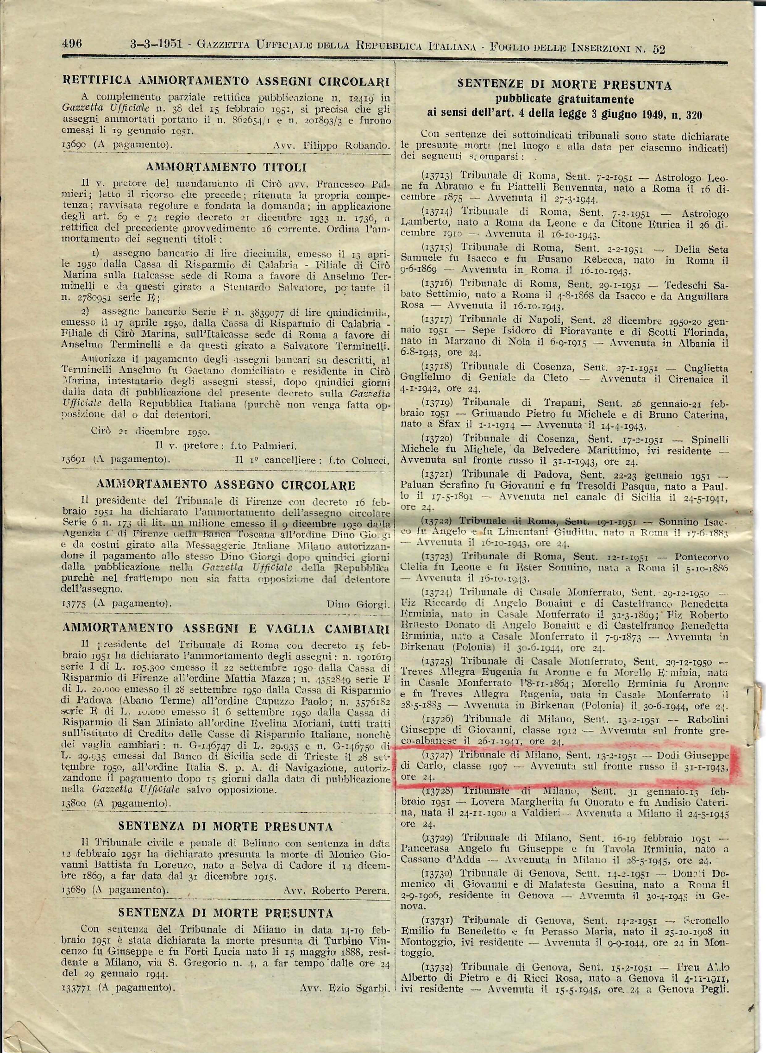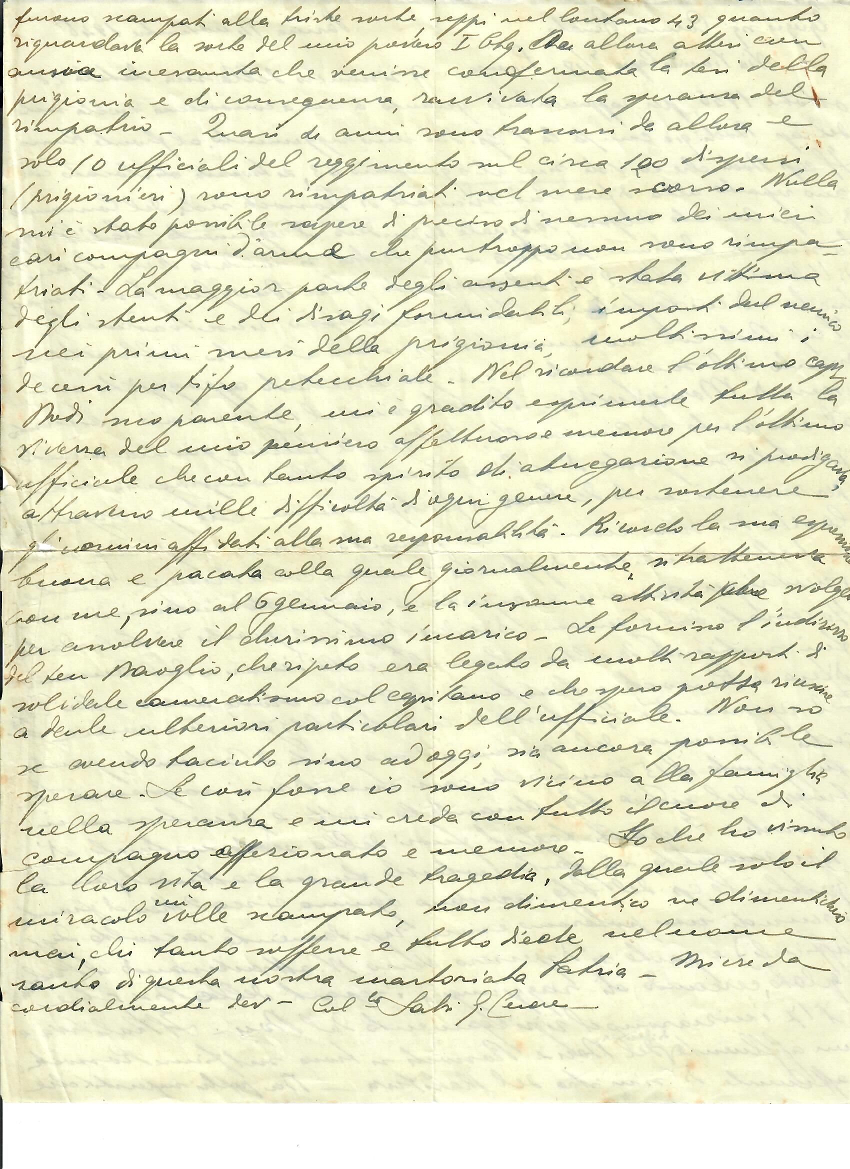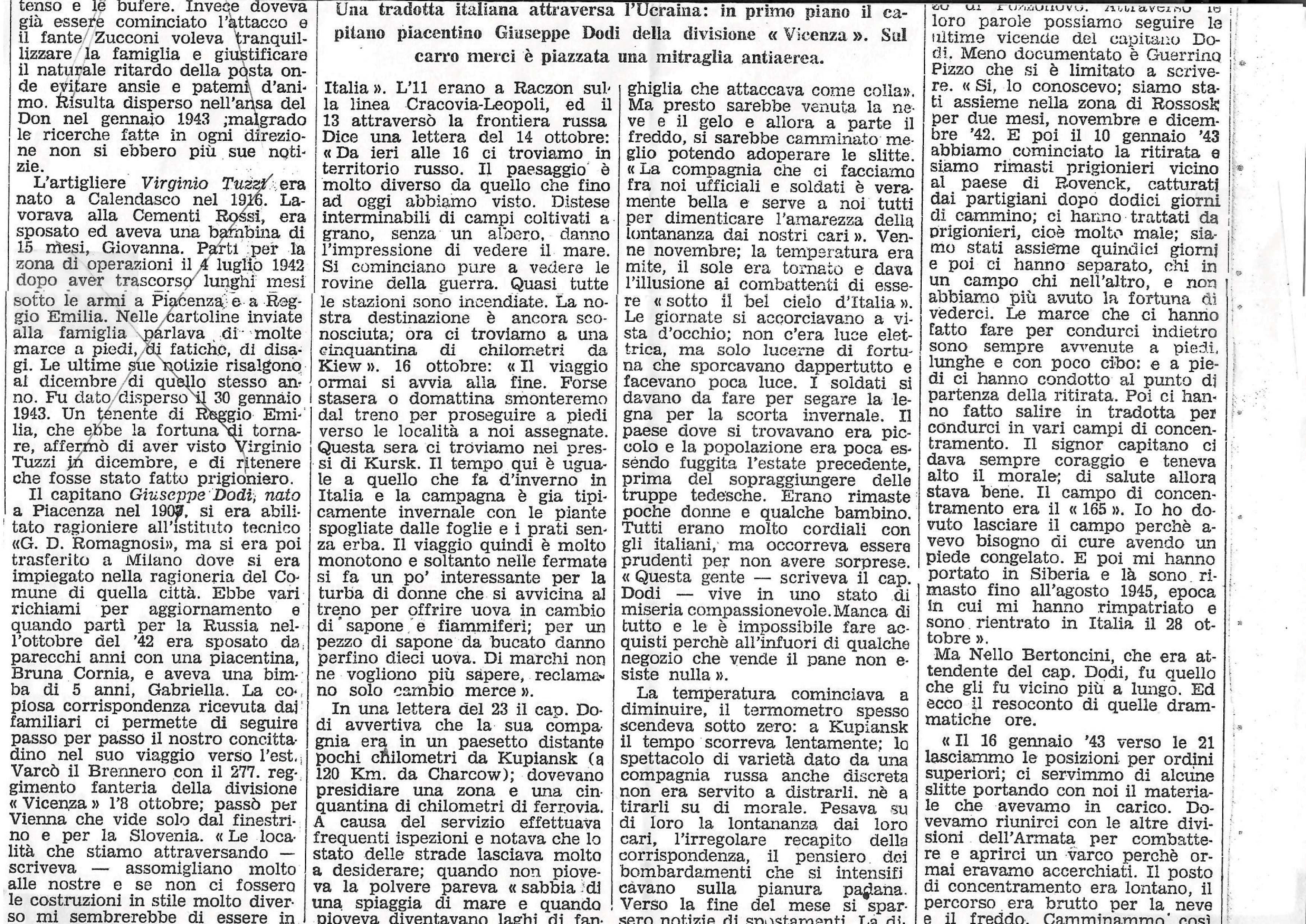 Ho cessato dal 6 gennaio di vedere l’ufficiale perché in tale data fui sostituito da altro colonnello nell’incarico del Comando del reggimento. Ho fissato la data del 15 gennaio come certa di presenza del capitano al suo posto di Comando, perché fu appunto il 15 gennaio che carri armati russi sorpresero le truppe del mio btg. durante la notte e penetrarono in Rossoch. I reparti tagliati fuori dalla sede naturale di ripiegamento, in parte notevole furono catturati (anche perché le cp. del btg. avevano ognuna circa 2 km di fronte e quindi non poterono essere rapidamente raccolte dagli ufficiali) e parte si dispersero verso N attraversando il Kalitva gelato, cercando di raggiungere i reparti della Div. che il 17 iniziarono il ripiegamento dal Don. Il Kalitva è un affluente di destra del Don e Rossoch si trova sul fiume Rossoch affluente di sinistra del Kalitva. Dai pochi superstiti che furono scampati alla triste sorte, seppi nel lontano 43 quanto riguardava la sorte del mio povero I° btg. Da allora attesi con ansia incessante che venisse confermata la tesi della prigionia e di conseguenza, ravvivata la speranza del rimpatrio. Quasi 4 anni sono trascorsi da allora e solo 10 ufficiali del reggimento sui circa 120 dispersi (prigionieri) sono rimpatriati nel mese scorso. Nulla mi è stato possibile sapere di preciso di nessuno dei miei cari compagni d’arme che purtroppo non sono rimpatriati. La maggior parte degli assenti è stata vittima degli stenti e dei disagi formidabili imposti dal nemico nei primi mesi della prigionia, moltissimi i decessi per tifo petecchiale. Nel ricordare l’ottimo Cap. Dodi suo parente, mi è gradito esprimere tutta la vivezza del mio pensiero affettuoso e memore per l’ottimo ufficiale che con tanto spirito di abnegazione si prodigava attraverso mille difficoltà di ogni genere, per sostenere gli uomini affidati alla sua responsabilità. Ricordo la sua espressione buona e pacata colla quale giornalmente si tratteneva con me, sino al 6 gennaio, e l’insonne attività che svolgeva per assolvere il durissimo incarico. Le fornisco l’indirizzo del ten Daoglio, che ripeto era legato da molti rapporti di solidale cameratismo col capitano e che spero possa riuscire a darle ulteriori particolari dell’ufficiale. Non so se avendo taciuto sino ad oggi, sia ancora possibile sperare. Se così fosse io sono vicino alla famiglia nella speranza e mi creda con tutto il cuore di compagno affezionato e memore. Io che ho vissuto la loro vita e la grande tragedia, dalla quale solo il miracolo mi volle scampato, non dimentico né dimenticherò mai, chi tanto sofferse e tutto diede nel nome santo di questa nostra martoriata Patria.