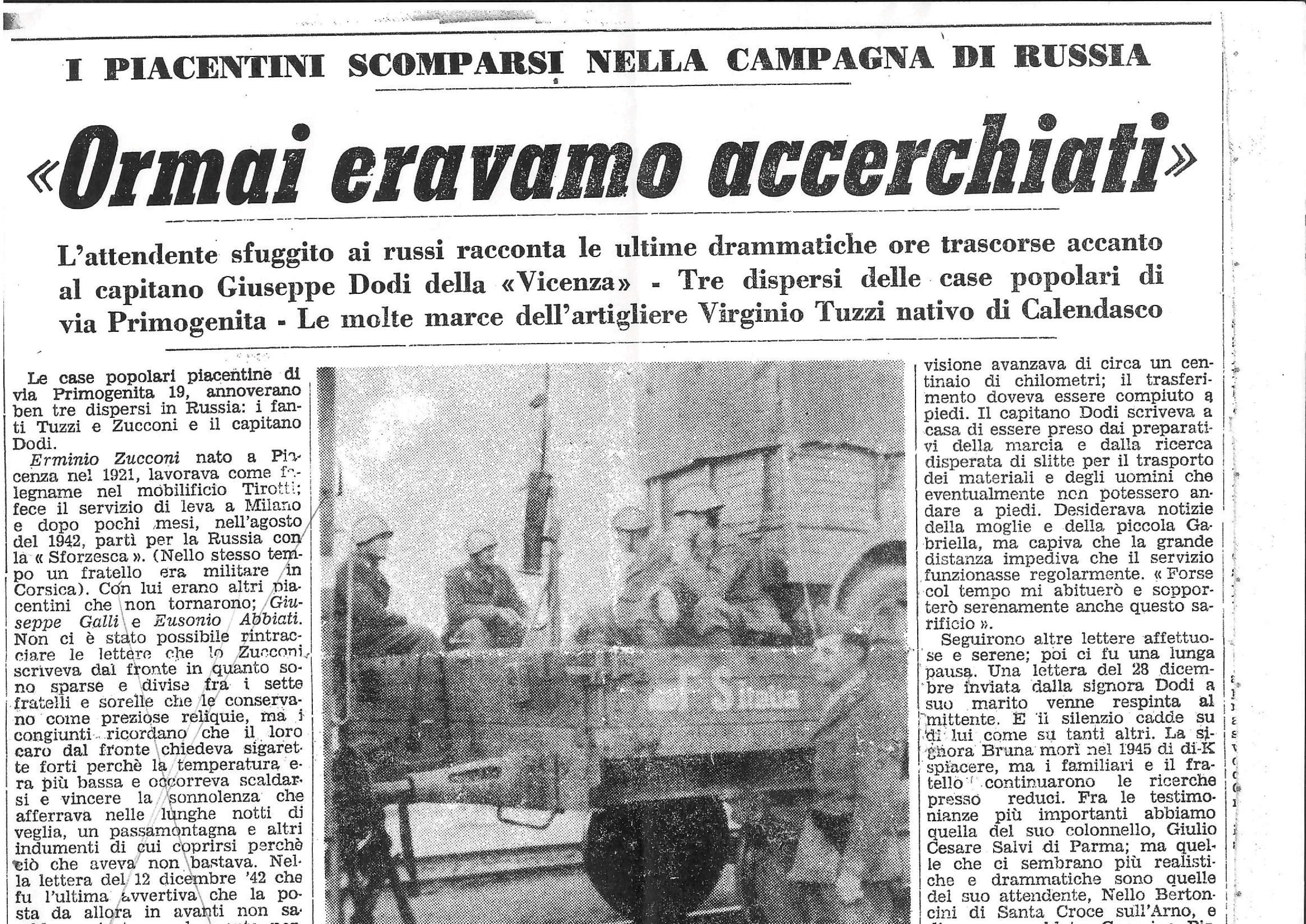 Erminio Zucconi nato a Piacenza nel 1921, lavorava come falegname nel mobilificio Tirotti; fece il servizio di leva a Milano e dopo pochi mesi, nell’agosto del 1942, partì per la Russia con la “Sforzesca”. (Nello stesso tempo un fratello era militare in Corsica). Con lui erano altri piacentini che non tornarono; Giuseppe Galli e Eusonio Abbiati. Non ci è stato possibile rintracciare le lettere che lo Zucconi scriveva dal fronte in quanto sono sparse e divise fra i sette fratelli e sorelle che le conservano come preziose reliquie, ma i congiunti ricordano che il loro caro dal fronte chiedeva sigarette forti perché la temperatura era più bassa e occorreva scaldarsi e vincere la sonnolenza che afferrava nelle lunghe notti di veglia, un passamontagna e altri indumenti di cui coprirsi perché ciò che aveva non bastava. Nella lettera del 12 dicembre ’42 che fu l’ultima avvertiva che la posta da allora in avanti non sarebbe arrivata regolarmente perché cominciavano il freddo intenso e le bufere. Invece doveva già essere cominciato l’attacco e il fante Zucconi voleva tranquillizzare la famiglia e giustificare il naturale ritardo della posta onde evitare ansie e patemi d’animo. Risulta disperso nell’ansa del Don nel gennaio 1943; malgrado le ricerche fatte in ogni direzione non si ebbero più sue notizie.