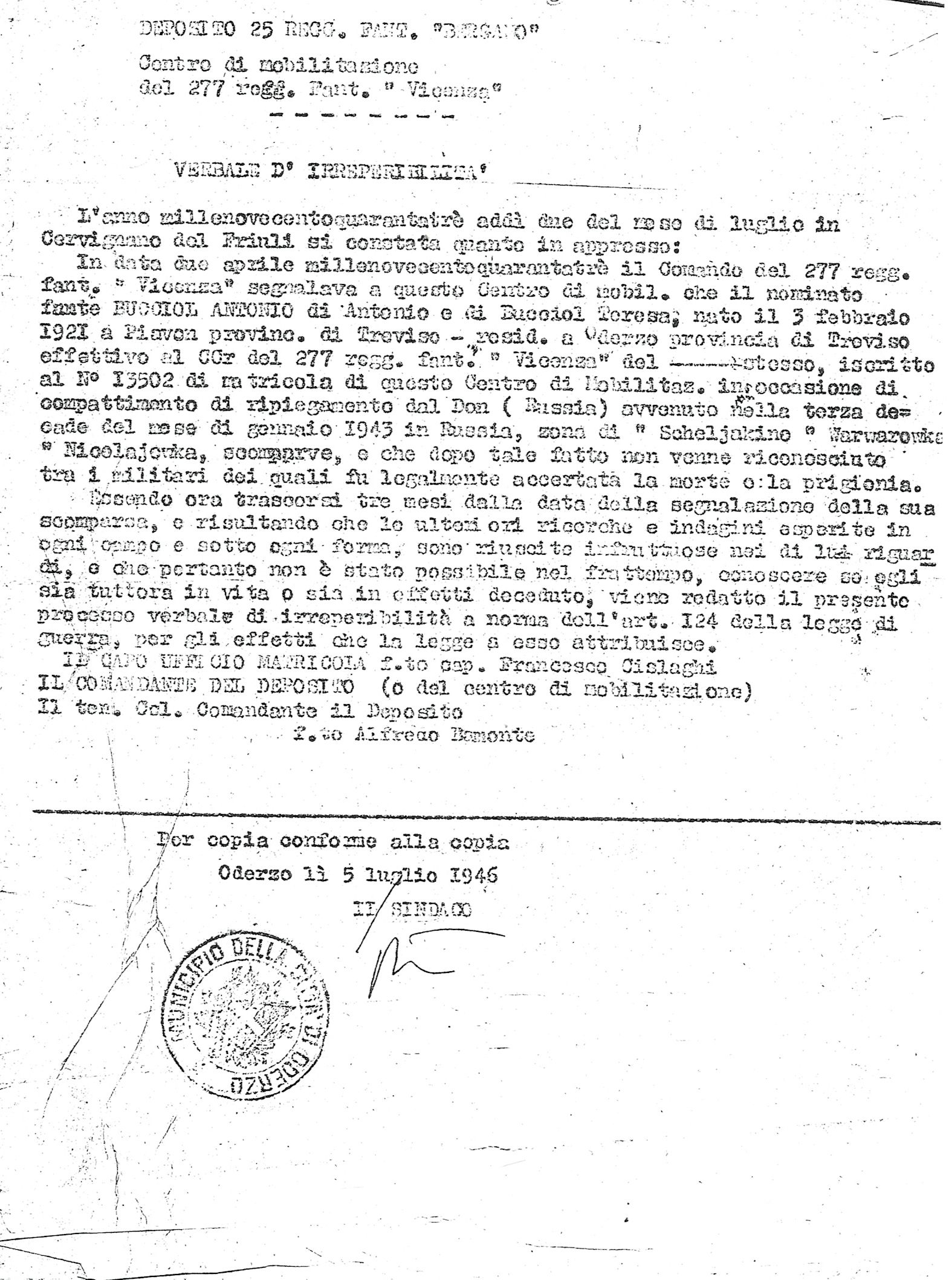 La documentazione su Antonio Filippo Bucciol proviene dall’archivio di Giovanni Periz (VI)